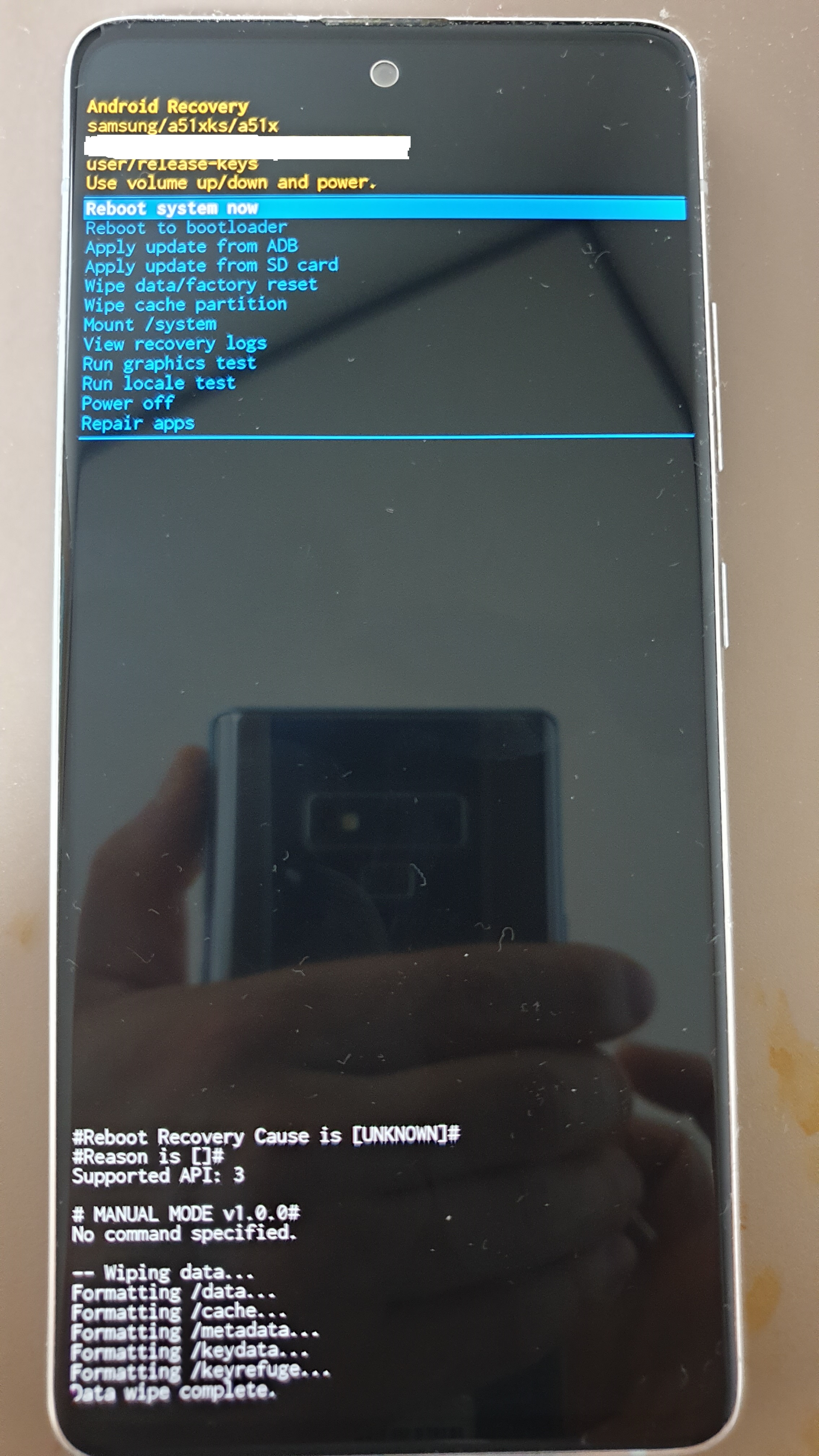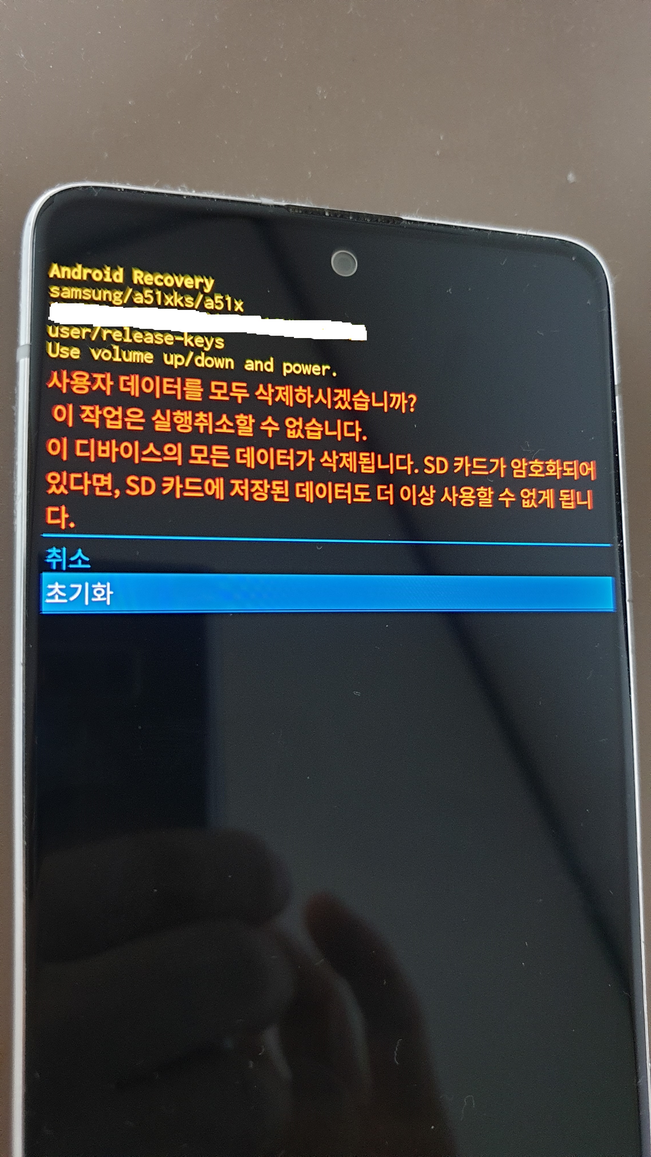 휴대전화 왼쪽 아래를 보면 Data wipe complete. 이 뜨면