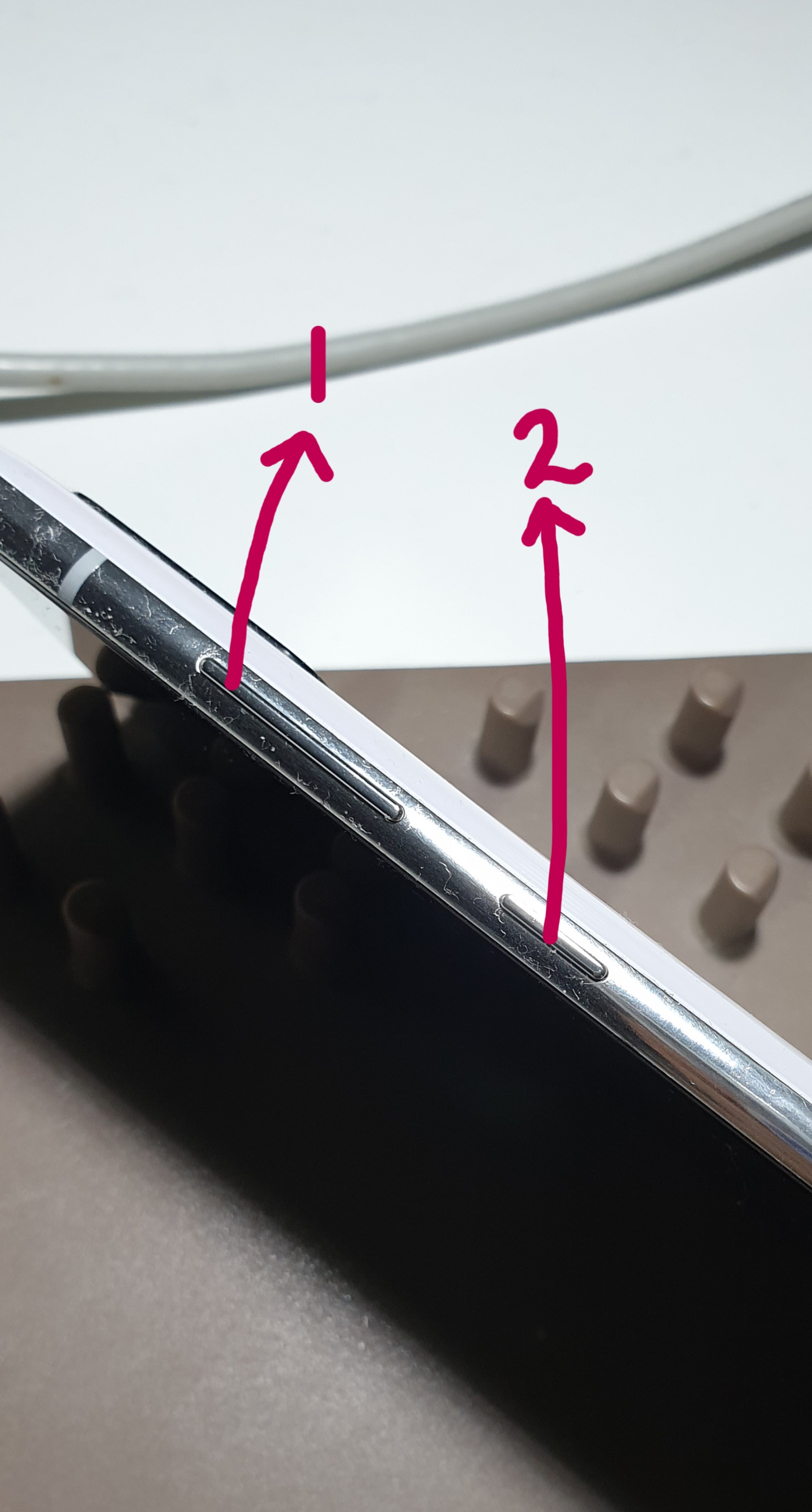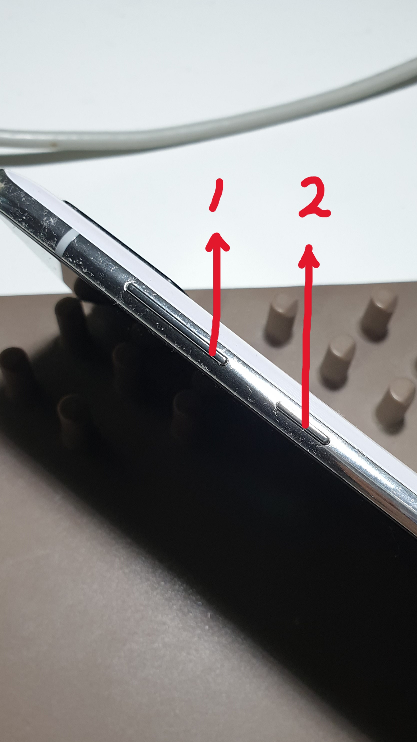 전원이 꺼진 상태에서 이번에는 볼륨 위 버튼과 전원 버튼을 동시에 눌러 약 6 ~ 7 초 정도