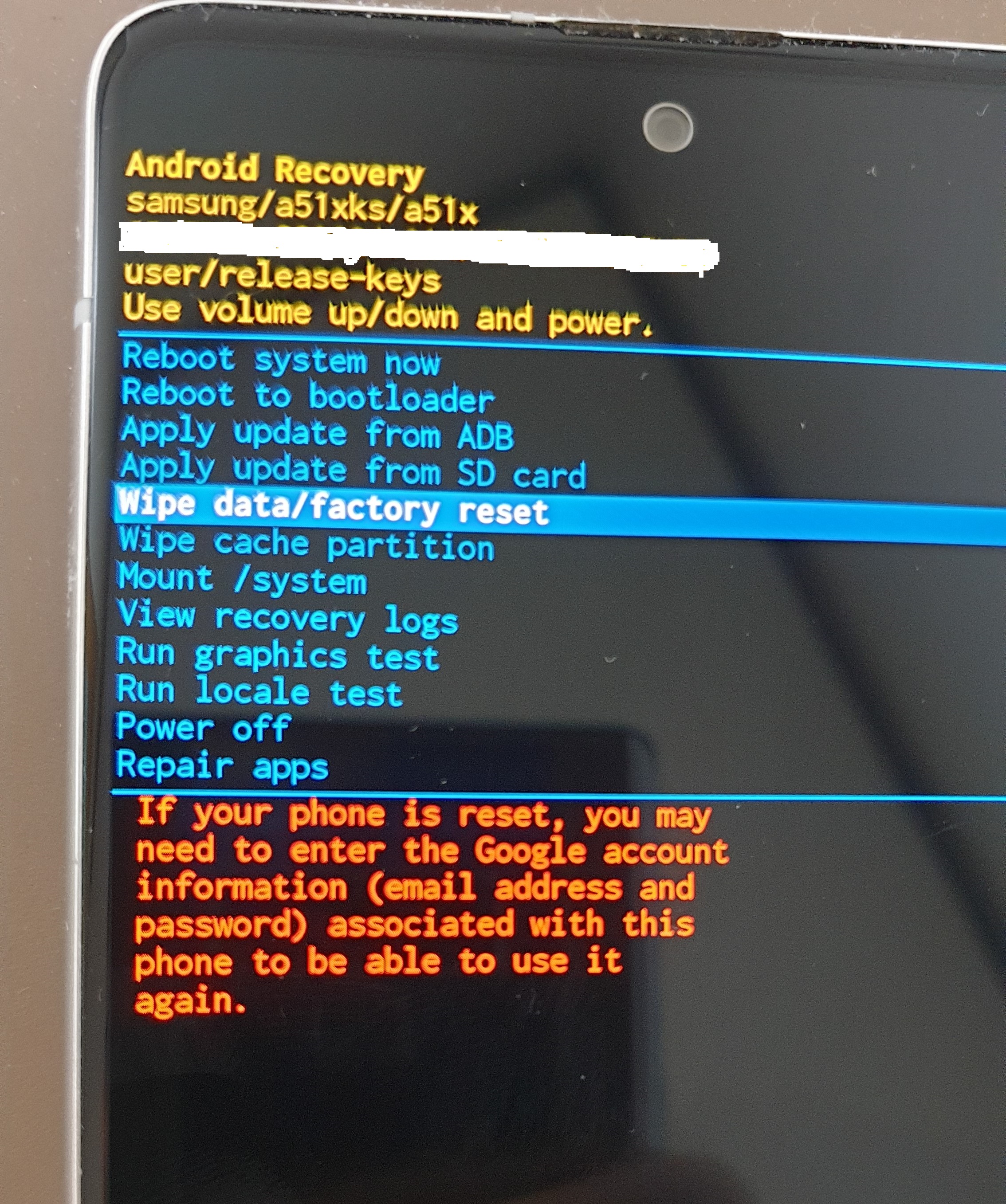 Wipe data / factory reset 을 선택 후 확인 버튼인 전원버튼을 누릅니다.